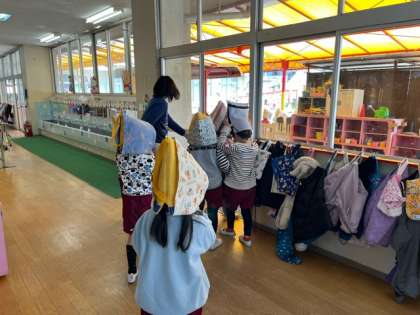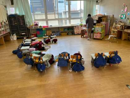 放送の後、すぐに椅子の下に頭を隠し、守ることができました。揺れが収まったということで、すぐに防災頭巾を被り、園庭に避難しました。