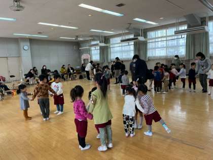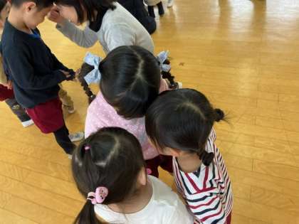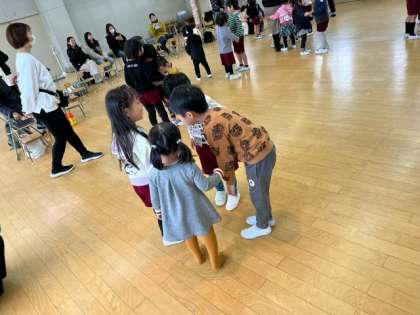 在園の子どもたちが新入園の子どもたちを誘って、おしりや頭、お腹をくっつけて遊びました。優しくあげるお兄さんお姉さんはとても頼もしかったです。