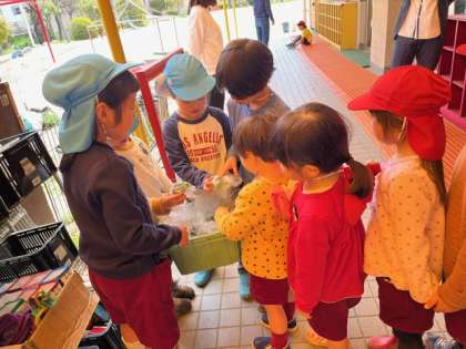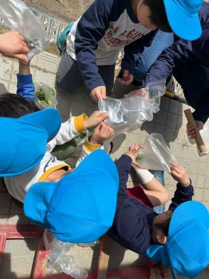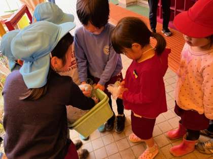あお組が、今日の預かり保育に来ている子どもたち、幼稚園にいる先生、午後から預かりにくる先生の数も聞いて、全員がもらえるように、数えて、分けてくれました。もも組、あか組も大喜びで並んでもらいました。