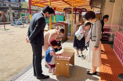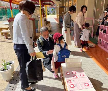入園式を迎えた子どもたちは、嬉しそうに幼稚園に登園してきました。おうちの人と手をつないで登園し、少し恥ずかしそうにしながら新しい名札をつけてもらっていました。