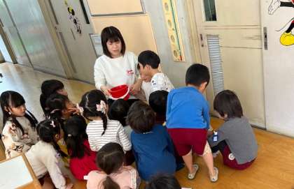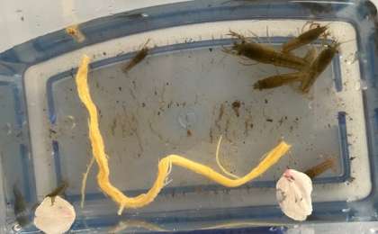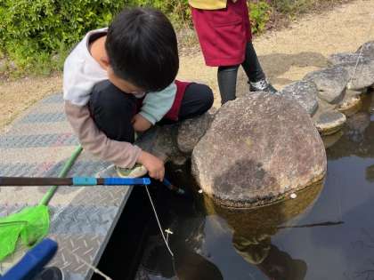ザリガニが橋の下にいることを見つけて、釣り竿を池に垂らして待っていました。しかし動きが早くて、「はやっ!」と子どもはびっくりしていました。「虫取りの網とかない?」と網で救うことを考えて、網を水の中に入れて待っていました。後ろに跳んで動いたザリガニが網の中に入って大興奮でした。その後、池の中のザリガニをすくって、友達やお家の人に見せました。「明日、また池に返してあげる」と言っていました。