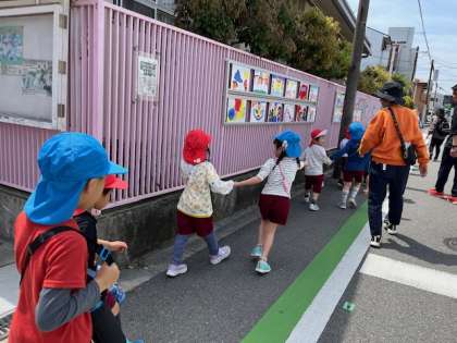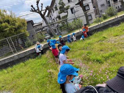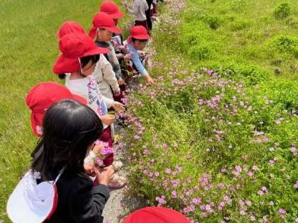 住吉大社の御田に園外散歩に行きました。田植え前の御田に入れていただきました。レンゲを摘ませていただきました。「お土産に持って帰る」「ママにあげる」と言いながら、きれいな花を手にいっぱい持ち、花束のようにしている子もいました。レンゲはお土産にして持って帰りました。
