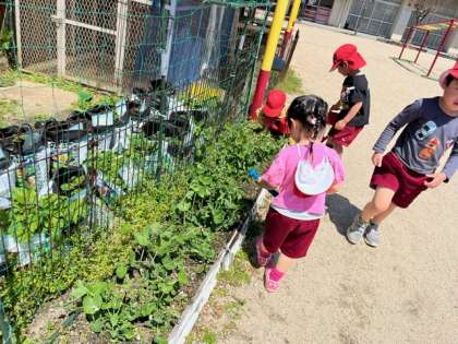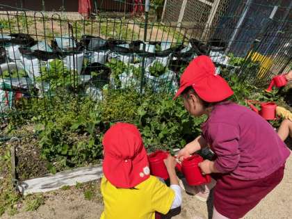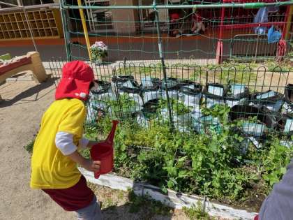 ずいぶん前に、自分たちで植えたスナップエンドウのつるが、4月になって暖かくなり、伸びてきました。あか組は、「お豆が伸びてきてるよ」「お水あげよう」「もう一回あげとくわ」とじょうろを手にして、水を汲んできて、そっと土に水をかけていました。