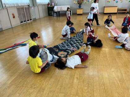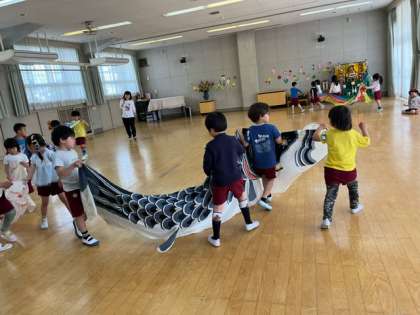 鯉のぼりを床に置いて、自分の身長と比べたり、大きい鯉のぼりの中をくぐってみたりしました。そして、吹き流し、まごい、ひごいなどを持って、歌いながら持って歩いて、楽しみました。