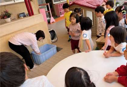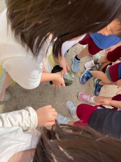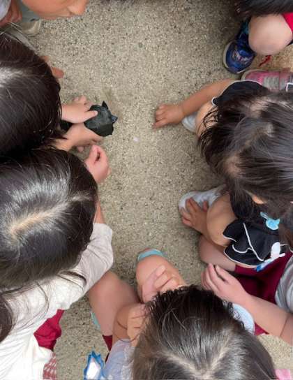 あお組の当番活動でするカメの掃除をみんなで確認しました。石を出して、カメも出して、お家を洗ってあげるとあお組みんなで言い合っていました。「カメさんがどこか行かないように気をつけてね」と言うと、「カメさんはゆっくりやから大丈夫」と言っていましたが、地面に連れて行くと、急に動き出し、「はやい!」とあわてて捕まえていました。