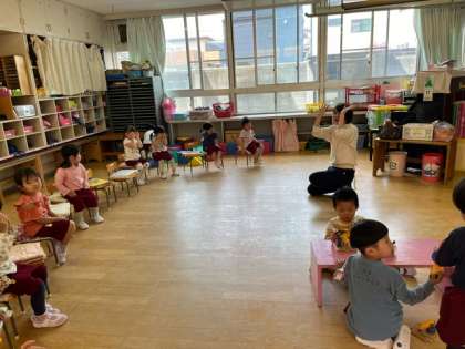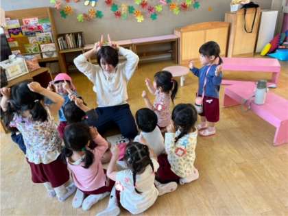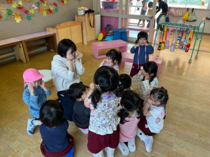 遊んだ後は、先生のそばに集まって、手遊びをしているところにも、次々と集まってきて楽しそうに手を動かしていました。自分の椅子も見つけて座ることもできていました。