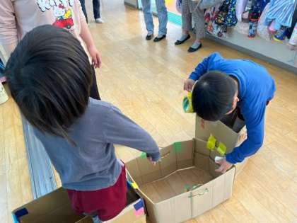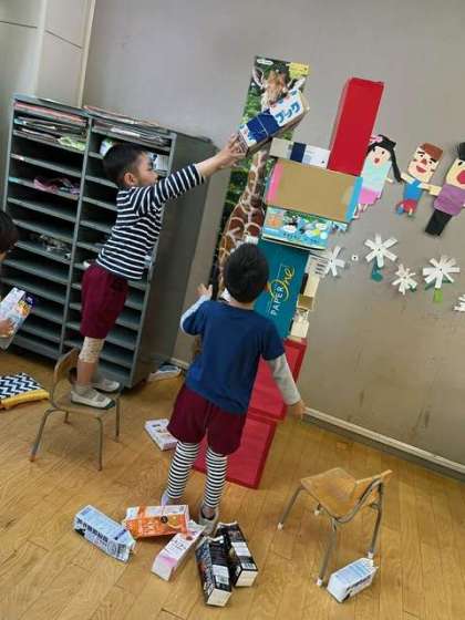 保育室では、いろいろな大きさの箱を積み上げ、キリンよりも高くしgたいと挑戦していました。