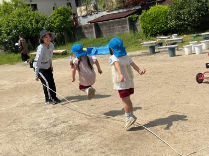 園庭では、友達と長縄跳びを何回跳べるか?に挑戦していました。