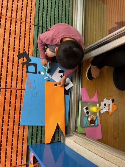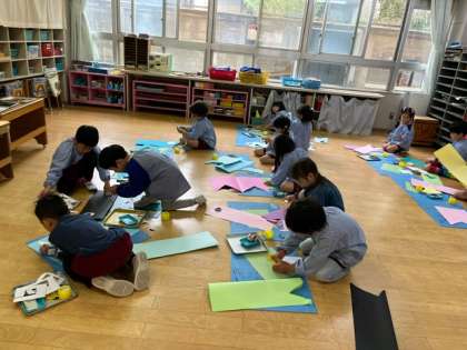 鯉のぼりで遊んだあお組は、自分の鯉のぼりを作ろうと思い出しながらていねいにつくっていました。