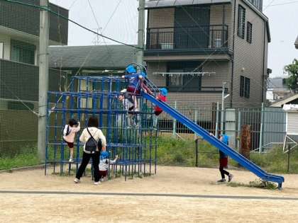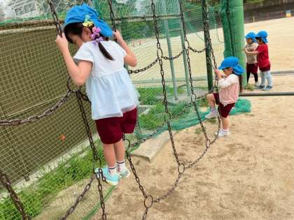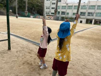 食後は広い校庭で遊具を使って遊ばせてもらいました。幼稚園のものより大きめの遊具に緊張しながらも、試していました。