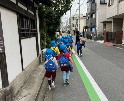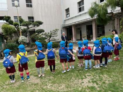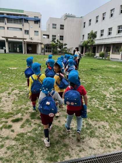 存分に小学校を楽しんだあお組は校長先生にお礼を伝え、しっかりと坂を登って幼稚園に帰ることができました。