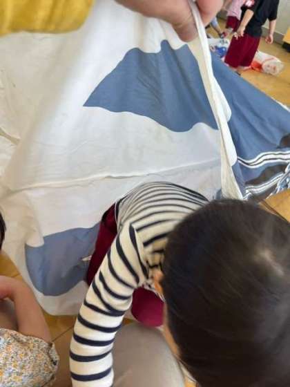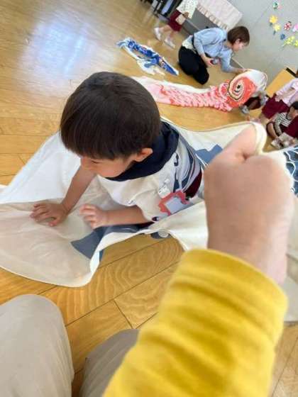 園庭にあげている鯉のぼりが床に置いてあるのを見つけたもも組は鯉のぼりの上でみんなで寝転び始めました。その後、お腹にも入ってみようとなり、「もう一回、もう一回」と何度もくぐっては出てきてにっこりする時間が続いていました。「鯉のぼりに食べられた」と笑っていました。