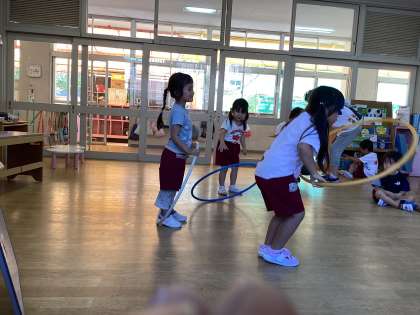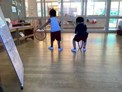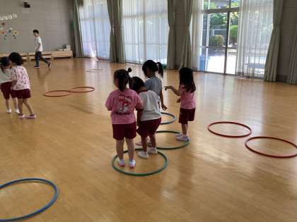 フープを使っていろいろな遊びを考えてみました。お家にしたり、色を見つけて中に入ったり、飛んだり、転がしてコマのようにして遊んだりしました。子どもたちの発想は面白いですね。