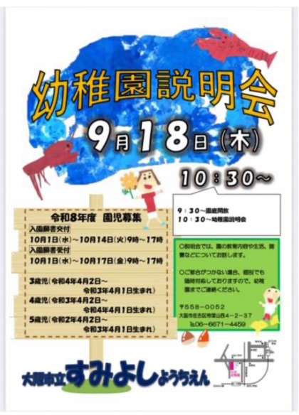 幼稚園説明会のお知らせ 公開日 2025/09/10 更新日 2025/09/10 園の様子 9時30分〜 園庭開放 10時30分〜 幼稚園説明会を行います。 ぜひ、幼稚園の様子を見に来てください。 いいね(0)