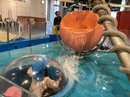 風を使ってビーチボールを飛ばしたりボールを転がしたり、ポンプを動かして水が流れてくるスリルを楽しんだりしていました。