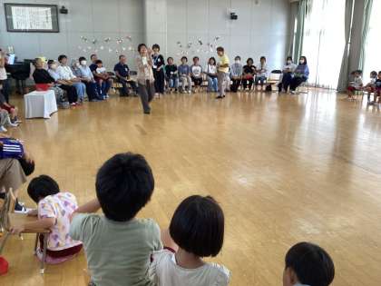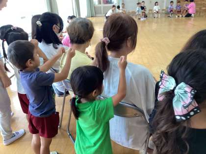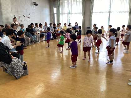子どもたちが楽しんでいる「めっちゃげんき体操」を見てもらったり、昔から遊んでいるコマやあやとりをおじいさんおばあさんに見せてもらったり、歌を歌ったりして楽しい時間を過ごしました。最後はおじいさんおばあさんの肩をたたいて、喜んでもらい、パワーのおすそ分けができました。子どもたちが気持ちを込めて絵をかいたプレゼントのキーホルダーは来られている方に手渡しできました。来られなかったおじいさんおばあさんにも持ち帰っているので、お家で渡せると喜んでもらえるかなと持ち帰っています。