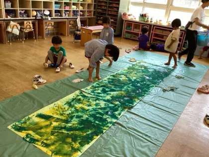虫の遊ぶ草を作ろうと、ローラーで遊びました。コロコロと転がるローラーを動かして草を製作しました。