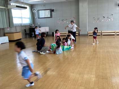 大好きな虫になって、敵に捕まりそうになったらピタッと動かずに止まったり、野原を駆けまわったり、捕まりそうになってあわてて草に隠れたりして楽しんで遊びました。