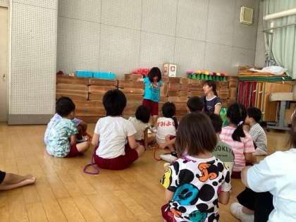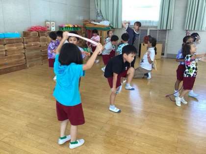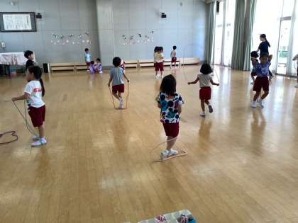 縄跳びを使って遊ぶとどんなことができるかな?と自分で考えて遊びました。ぴょんぴょん跳ぶだけではなくて、お家を作って入ったり、くるくる回したり、体の周りを回したり、しっぽ取りをしたりしていろいろな遊びができることを見つけていました。
