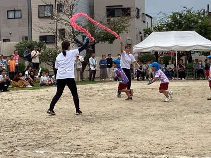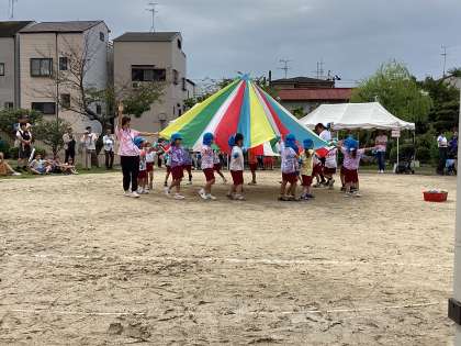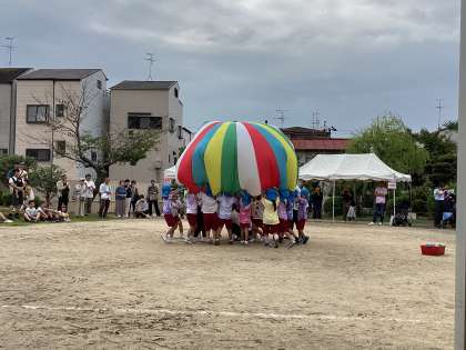 みんなで「火の輪くぐり」では髪の毛が燃えてしまわないように火の輪をくぐっていきました。パラバルーンでは、気球やメリーゴーランドなどあお組で気持ちを合わせて今までで1番素敵なパラバルーンになりました。