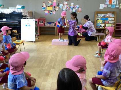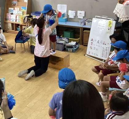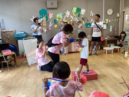 閉会式の途中で雨が降ってきて、急に雨が降ってきて、あわてて保育室に入ることになりました。保育室でゆっくりと、子どもたちは金メダルを首にかけてもらい、頑張ったことをみんなに褒めてもらって嬉しそうでした。