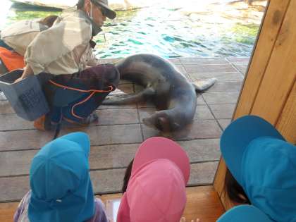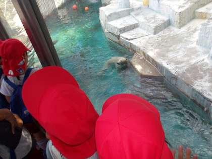 アシカが泳いでいるのを見たり、ご飯をもらっているところをガラス越しに見て、大喜びしていました。シロクマも水に飛び込んだり、うろうろと歩いて、トンネルを通っているところを見て、喜んでいました。