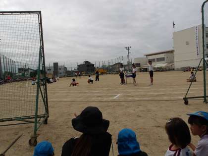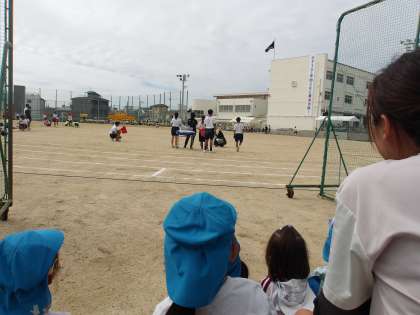 住吉中学校の体育大会を見学させてもらいました。目の前を走る中学生に、大きな声で応援の声を送っていました。トラックを走っているのを見て、「一緒やな」と言ったり、リレーでは、「早いな」「いっぱい走るな」「幼稚園のバトンと違う」と興味をもって見ていました。あお組は自分たちもリレーをしたので、共感したり、職場体験に来てくれたお兄さんお年産のことを思い出し、「走ってるのかな?」と探していました。住吉中学校の皆さん、見学させていただいて、ありがとうございました。