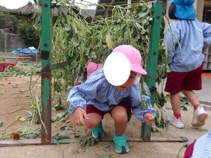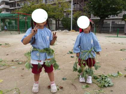 子どもたちはツルで長縄をしたり、トンネルにしてくぐったり、体に巻き付けて飾りにしたりして遊んでいました。遊んだ後のツルは、先生たちはみんなでリースにして、乾燥しています。また、使えるかな。