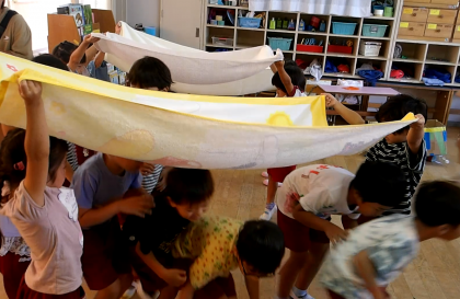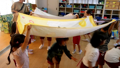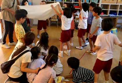 あお組さんが一緒に、タオルをくぐったり、シーソーにしたりして、真剣に再現をしていて、先生にも指示をしながら、パラバルーンにもして遊びました。今度は、本物を使って、「あお組さんと一緒に遊びたいな」と言っていました。また一緒にしようね。