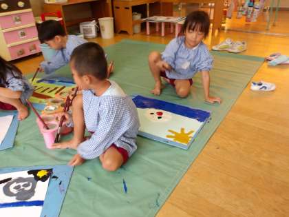 絵の具で、楽しかったことを紙に思いきり表現しています。自分の体で表現したり、先生と話をして笑いながら、「ザブーンってお水に入ってたよ」「お水飛んでたよ」と楽しく話していました。