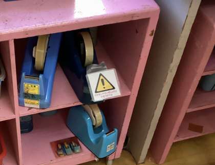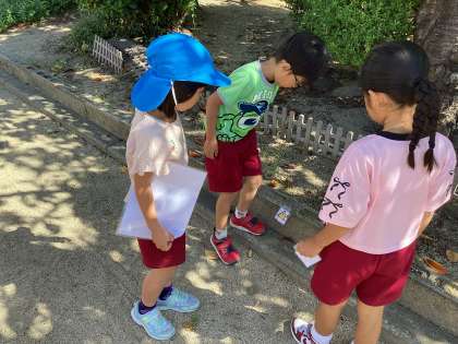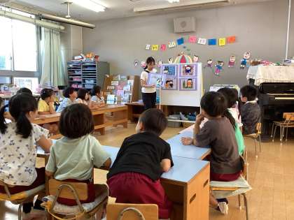 あお組にけが予防の保健指導をしました。けがをしやすい場面を知らせてから、幼稚園の中でけがをしたことのある場所やけがをしやすい場所を探す活動をしました。「ここの角が危ないと思う!」「ここでけがしたことあんで」と友達と話し合いながら探していました。見つけた場所には、「けがにきをつけてねマーク」をつけて、どうすればけがをしないようにできるかを話し合いました。今度は、「けがにきをつけてねマップ」を作って、あか組ともも組に知らせようと思っています。