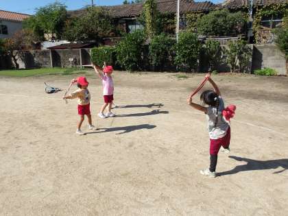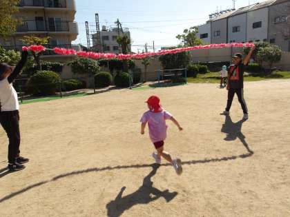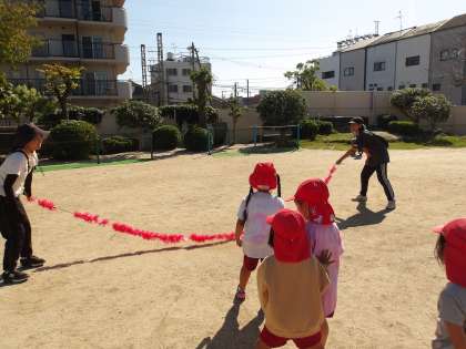 「ウキウキパレード」したいねん」と縄跳びで遊びを真似したいと言い、音楽を借りてきたりして、自分たちで縄跳びを持って遊びを楽しんでいました。そして、以前から言っていた「火の輪くぐり」したいとあか組の子どもたちは、みんなで協力して片付けをして、並んで待っていました。くぐり始めると、一方懸命に縄を見て走り抜けていました。