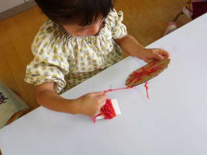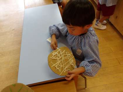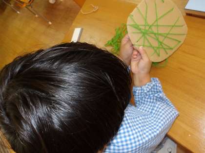 園庭に栗の木があり、イがが落ちてるいるので、子どもたちは見つけていました。毛糸を使ってイガをまいて「難しい」と言いながらもつくり、中に栗も作って貼りました。最後は「できた!」と喜んでいました。
