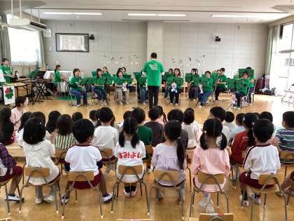 子育てセミナーでクローバーさん(ママさん吹奏楽)が来てくださいました。「夢をかなえてドラえもん」や「手のひらを太陽に」など子どもたちに馴染みのある曲からクラシックメドレーなど様々な曲を演奏してくれました。子どもたちは、迫力ある楽器の音色に心を躍らせ、手拍子をしたり一緒にうたったりと楽しんでいました。普段聞けない吹奏楽を間近で聴かせていただき、豊かな感性の育みにつながりました。