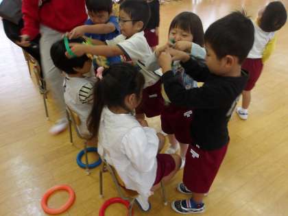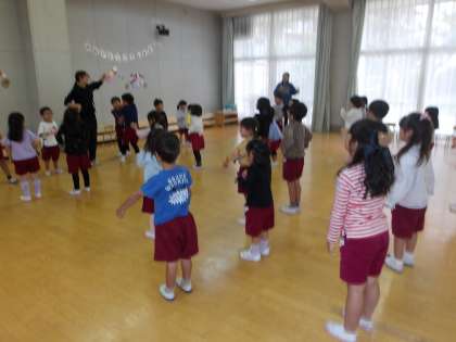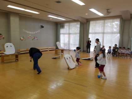 10月生まれの子どもたちの誕生会をしました。もも組の子どもがつくってくれたクリのペンダントをプレゼントにもらいました。みんなの大事なものを取りに来たおばけを、お家の人と一緒に倒しました。大変でしたが、力を合わせて頑張って倒していました。最後は、「おばけのバケちゃま」のダンスを楽しみました。