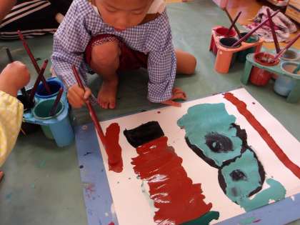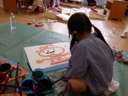 絵の具で思いを表現しました。ゆっくりと先生と話をしながらかいていくと、かいていたものが変わっていくこともありますが、「そうや」と自分のかいた絵から思いを膨らませて、楽しそうにかいていました。子どもの絵には話がいっぱいありますね。