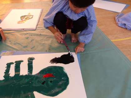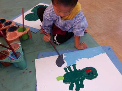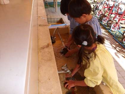 カメが好きな子どもたちが、掃除をしてくれて、石もカメの甲羅も洗ってくれました。そのあと、「カメさん、かきたい」と絵の具でカメをかいて、楽しんでいました。