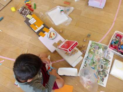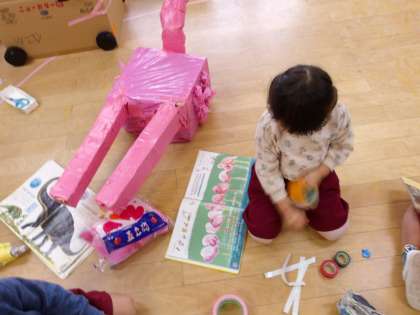 登園するとすぐに用意を済ませて、製作を始める子どもたち。ゾウやフラミンゴ、恐竜を作っていると、「フラミンゴって何食べてるん?」と不思議そうにしていました。そこで絵本室から動物や恐竜の図鑑を持ってきて、みんなで調べてみることにしました。調べてみるとニンジンやエビを食べていることを知って、みんなびっくり!ワニやゾウ、恐竜についても調べました。「食べるものも作ってあげないと!」と製作を楽しんでいます。