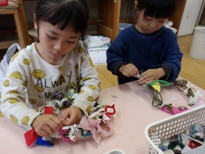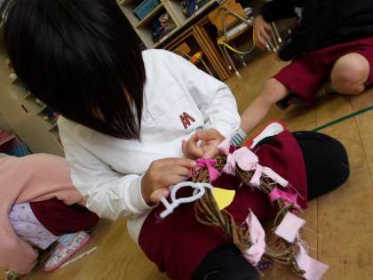 リースに布を結んで、飾ろう 公開日 2025/11/13 更新日 2025/11/13 園の様子 サツマイモを収穫したときのお芋のツルを使って、リースを作っていました。ツルが乾いてきたので、布を結んで飾りを作ることにしました。「どんな色にしようかな」「これ好き!」と自分で布を選びながら、結んでいきました。「なんかかわいくなってきた」と言っていたり、同じ模様の布を探している友達がいると探してきて渡してあげたり、リースの飾りつけを一生懸命にして楽しんでいました。 いいね(0)