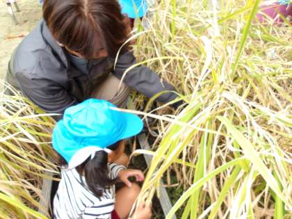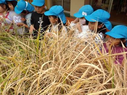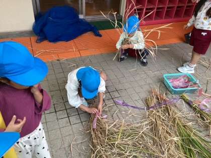 幼稚園の田んぼの稲が穂をつけ、スズメがどんどん食べに来るので、稲刈りをすることにしました。「あー、これはスズメに食べられてお米がないな」「こっちはいっぱいついてる」と稲穂を確認していました。稲を持ち、ハサミを使って切っていきました。「硬いな」と言いながらも刈り取り、束にして干しました。子どもたちは上手にしばっていました。
