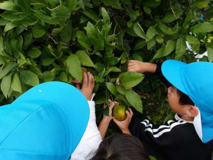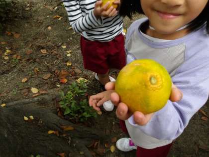 園庭にできている柿とミカンを収穫しました。ミカンは今年は不作の年で40個しか取れませんでした。子どもたちが自分たちで「ねじって取るねんで」と言いながら、木の中のほうでできているミカンも見つけて、収穫しました。