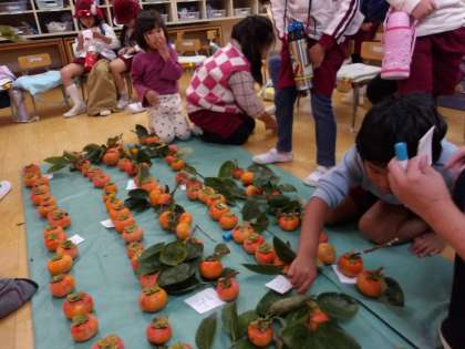 柿は、高いところになっていて、木も硬いので事業担当主事さんや先生が収穫して、運ぶのを子どもたちが手伝ってくれました。あお組が保育室で数えてみると、96個もありました。「ほしいな」「柿好きやねんな」と言い、「みんなの分あるな」「子どもたちと先生たち、預かりの先生たちにも分けないとあかんな」と計算してくれて、みんなが持って帰れそうなので、「また分けよう」ということになりました。秋の収穫を楽しむことができました。