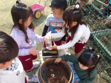 「めっちゃ大きくなってる!」カブトムシの幼虫が大きくなっていることに気が付いた子どもが教えてくれました。うんちもたくさんになっていたので、子どもたちと一緒にお掃除をしました。カブトムシになるのが楽しみですね。