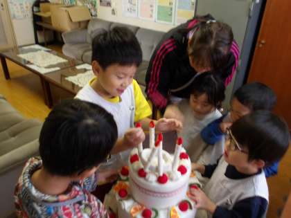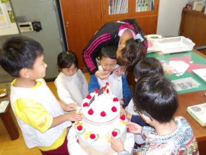 園長室でお祝いしたよ 公開日 2025/11/19 更新日 2025/11/19 園の様子 とっても楽しみにしていた園長室での時間。一人ひとりお祝いのバッチを園長先生につけてもらいました。園長室にある大きなケーキをみんなで囲んで「ふ〜」とろうそくを消すふりをしたり、「おいし〜!」「ぼくはキュウイがいいな」「イチゴがいいな」と食べたりしました。一年に一回だけの特別な時間を楽しんでいました。 いいね(0)