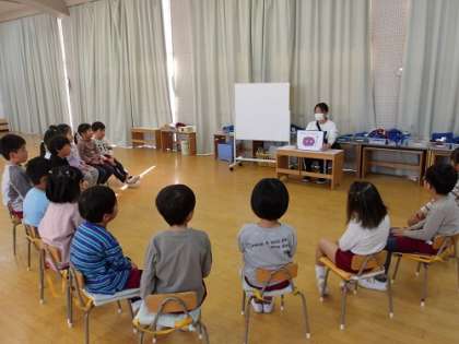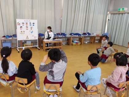 インフルエンザなどの感染症がだんだんと流行ってきたため、かぜ予防の保健指導をしました。人間からは見えない、かくれんぼ上手な「ばいきんくん」がみんなの体の中に入って悪さをする紙芝居を読みました。ばいきんくんが悪さをすると、つらい熱が出てしまいます。話をした後には、みんなで手洗いをしに行っていました。また、「のどが乾燥するとばいきんくんがのどにくっつくらしいよ」と友達に教えながらうがいをしている子どもたちもいました。