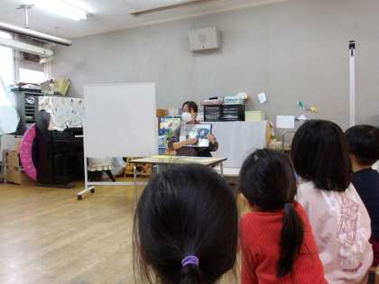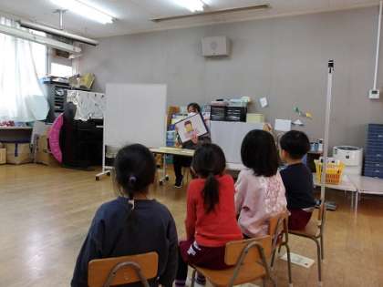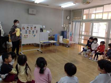 あか組にかぜ予防の保健指導をしました。かくれんぼ上手なばいきんくんはいつもみんなの近くにいて、みんなを狙っていることを紙芝居で知らせると、「手洗いしないと!」「ばいきんくん僕の手にくっついてるの見えるよ」と自分や友達の手を見て、ばいきんくんを探していました。あわあわ手洗いの歌をみんなで思い出し、ばいきんくんに負けないように頑張ろうと意気込んでいました。