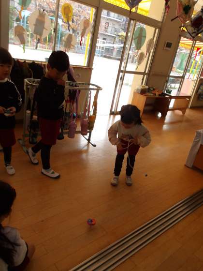 あお組の子ども達がこままわしに挑戦しています。じっくりとひもをこまに巻き付けています。投げ方のコツがわかるまで先生の回し方を見たり、手を添えてもらったりして何度も何度も回していました。「先生!一緒にして」とお願いしていましたが、「〇〇ちゃんならきっとできるよ!」と担任の先生に励まされ一人で挑戦してみることに。「1、2、3!」で投げてみると、まわりました!!「まわったー!」と大喜びです。先生や友達にも「すごい!」と言ってもらえて満足そうな表情をしていました。