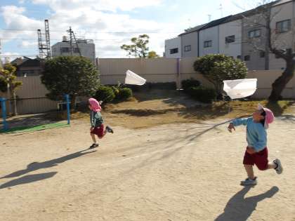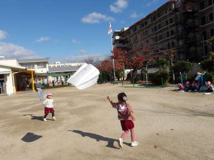 「見て、飛んだ!」と嬉しそうに何度も見せてくれました。午後からも「たこあげしたい」と言って元気いっぱい走っていました。どんどんと寒くなってくるので、戸外で元気に体を動かせるようにしたいです。