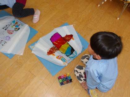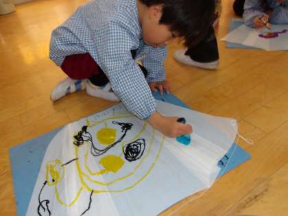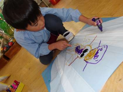 もも組やあか組がたこを飛ばしているので、あお組も絵をかきました。ていねいにたこ全面にいろいろな色を使って、楽しそうにかいていました。空に飛ばすのが楽しみですね。