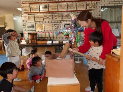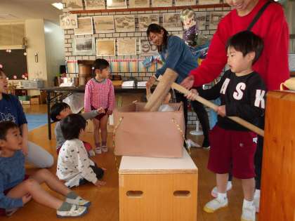 重いきねを持って、一所懸命に持ち上げ、「よいしょ、よいしょ」と力を込めて振り下ろしていました。もも組は初めてのお餅つきです。道具を見たり、お米を洗っているところを見たり、きねを持って練習してみたりして、お餅つきが分かってきています。明日は、楽しみですね。